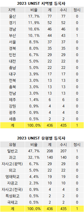 등록자를 배출한 고교를 지역별로 분석해 보면 UNIST의 소재지인 울산에서 가장 많은 77명을 배출했다. 전체 등록인원의 17.7%에 해당하는 비중이다. 이어 경기 52명(11.9%), 경남 46명(10.6%) 순으로 톱3다.