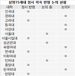 서울대 성대 인하대는 논의 중인 단계다. 서울대는 실질적으로 학폭 이력을 반영하고는 있었지만 이번 사건에서 학폭 전력이 있어도 무리 없이 입학한 사실이 알려지며 실질적인 반영 방법 역시 교육부 지침에 따라 달라질 것으로 보인다. 성대 관계자는 “현실적으로 정시에 학폭이 반영이 안 되다 보니 이를 반영할 수 있도록 고민은 계속 하고 있다. 학폭 기준이 애매해 교육부에서 뭔가 방침이 나온다면 좋을 것 같다”고 설명했다. 인하대는 “논의는 정시뿐 아니라 전방위적으로 하고 있다. 아직 방향을 모르겠어서 계속 논의 중”이라 밝혔다.