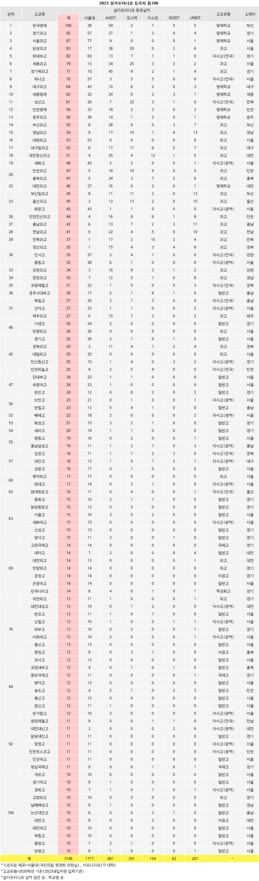 2023대입에서 ‘설카포지디유’ 등록자를 가장 많이 배출한 고교는 한국영재다. 서울대 28명, KAIST 59명, 포스텍 2명, 지스트 1명, DGIST 5명, UNIST 5명으로 총 100명이다. KAIST 부설 학교답게 KAIST 등록자가 압도적이다.