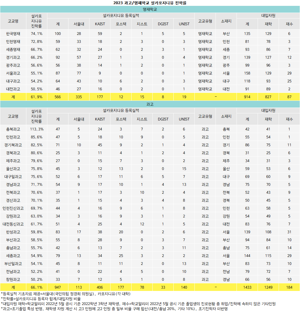 전국 8개 영재학교는 914명의 대입 자원 가운데 566명이 설카포지디유에 진학해 평균 61.9%의 진학률을 기록했다. 한국영재 74.1%에 이어 인천영재 72.8%, 세종영재 66.7%, 경기과고 66.2%, 광주과고 56.6%, 서울과고 55.1%, 대구과고 54.2%, 대전과고 50.5% 순이다. 전년보다 설카포지디유 진학률이 상승한 곳은 인천영재 세종영재 경기과고 서울과고 대구과고 5개교다. 특히 경기과고의 경우 전년 47.4%로 절반에 미치지 못하는 수준이었으나, 2023학년에 66.2%로 크게 올랐다.