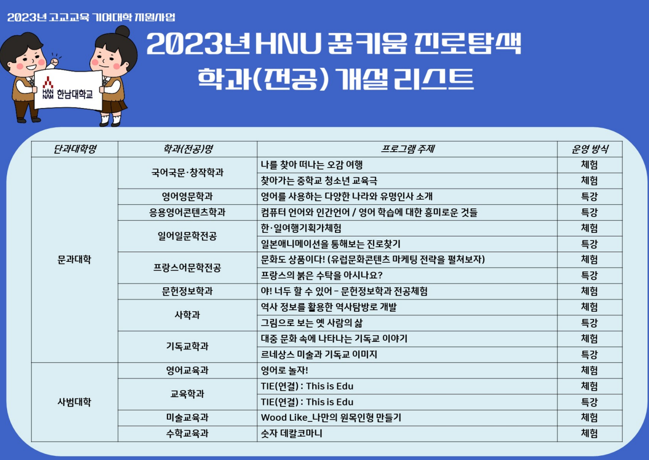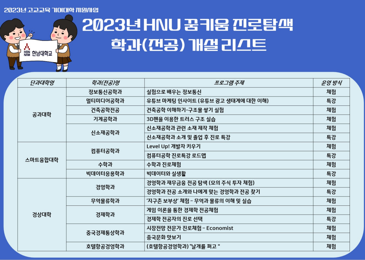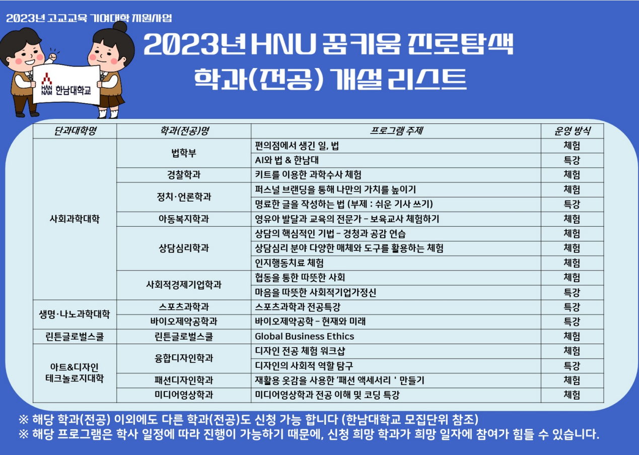 [베리타스알파=김해찬 기자] 한남대가 고교생을 대상으로 진로탐색 프로그램을 진행한다고 최근 밝혔다. 프로그램명은 ‘HNU 꿈키움 진로탐색’이다. 고교방문형과 대학방문형 2가지 유형이 있다. 고교방문형은 교교에서 원하는 프로그램과 날짜를 선택해 참가신청을 하면, 대학에서 날짜를 확정해 학과 교수와 재학생이 고교를 방문, 진로체험 특강/프로그램을 진행한다. 전국 소재 고교에서 신청 가능하다. 대학방문형은 신청한 고교에서 한남대를 방문해 특강/프로그램을 진행하는 방식이다. 37개 학과에서 54개의 특강/체험 프로그램을 운영한다. 프로그램은 5월 1일부터 10월 31일까지 진행한다. 신청기간은 10월2일까지 한남대 홈페이지에서 가능하다. 행사는 1일 1개교만 진행하며, 선착순으로 마감될 수 있다. 행사 진행을 수월하게 하기 위해 프로그램 진행 2주전에는 신청을 부탁한다는 설명이다.
