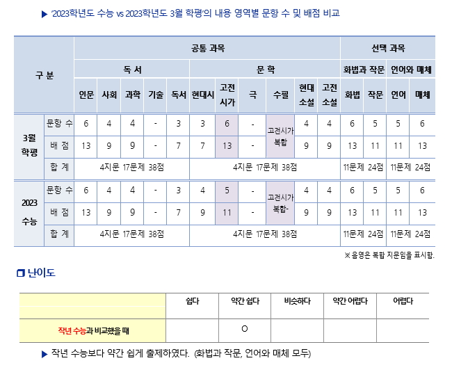 문학에서 그림을 활용한 <보기>가 출제됐지만, 작품 내용 이해라는 점에서 신유형이라 보기 어렵다. EBS 교재와 연계된 작품은 출제되지 않았으며, 낯선 작품이 다수 출제되었으나 문제 유형은 기존 수능 및 모평과 유사하여 난이도는 높지 않은 것으로 예상된다.