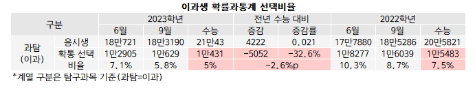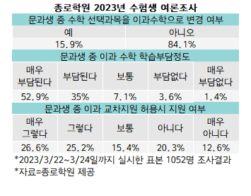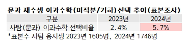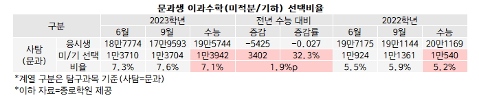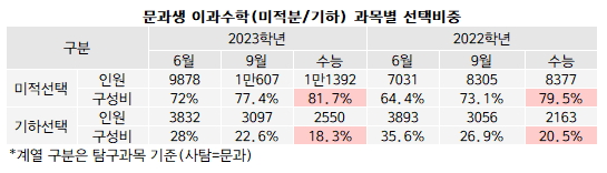 종로학원은 올해 2024수능에서 문과생의 이과 수학 선택 비율이 3년 연속 상승해 10%대까지 치솟을 것으로 보고 있다. 2022수능 땐 5.2%, 2023수능 땐 7.1%였다. 임 대표는 “문과생 중 수능에서 이과 수학을 선택하는 학생 비중이 올해 통합수능 3년 차에서 가장 커질 전망이며 10%대에 육박할 것으로 본다”며 “재수생 표본조사에서 문과 재수생 중 이과 수학을 선택한 비율은 지난해 2.4%에서 올해 5.7%로 2배 이상 증가한 점도 이를 방증한다“고 설명했다.