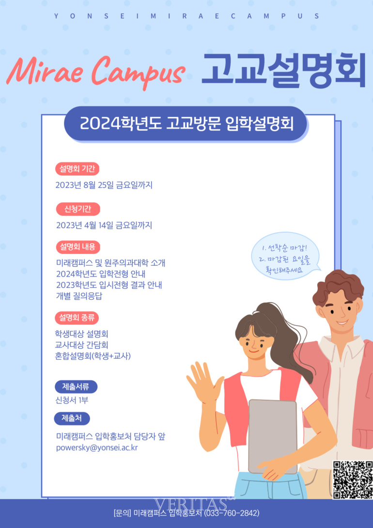 [베리타스알파=김해찬 기자] 연세대(미래캠)가 2024학년 고교방문 입학설명회를 연다고 최근 밝혔다. 고교에서 신청서를 작성해 메일로 접수하면, 입학처에서 날짜를 확정하고 고교를 방문하는 방식이다. 방문은 내달 24일부터 8월 25일까지 진행하며, 신청은 내달 14일까지 가능하다. 학생 학부모 교사를 대상으로 하는 입학설명회와 교사를 대상으로 하는 교사 간담회 2가지 유형이 있으며, 중복 신청 할 수 있다. 설명회와 간담회에서는 2023 입시결과, 2024 전형, 캠퍼스와 의과대학에 대한 안내를 할 예정이다.