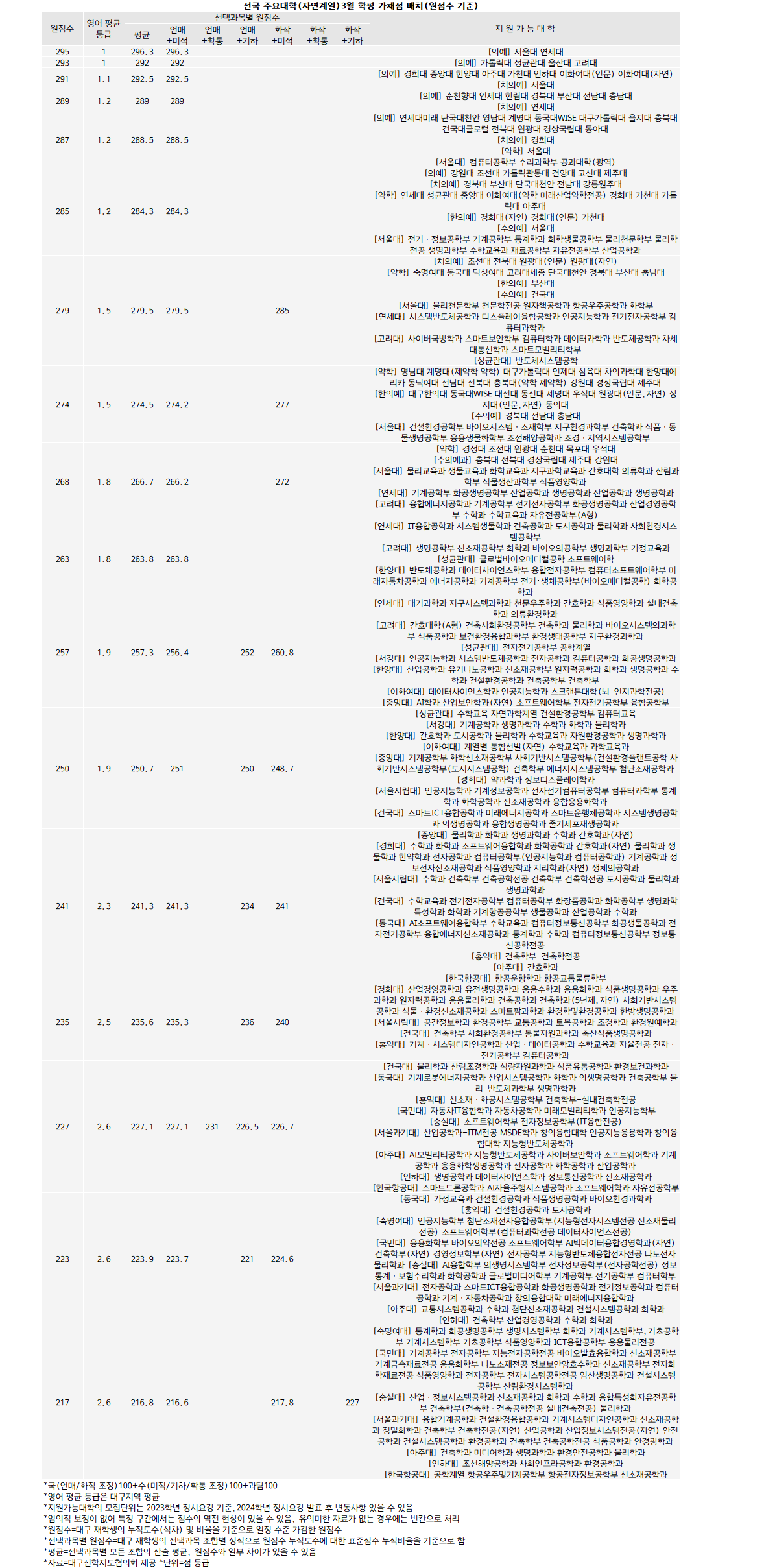 3월학평 원점수 300점 기준으로 분석한 결과, 자연계에서 지원 가능 점수가 가장 높은 곳은 서울대와 연대의 의예다. 원점수 295점(평균 296.3점)/언매+미적 296.3점)으로 가장 높다는 분석이 나왔다.