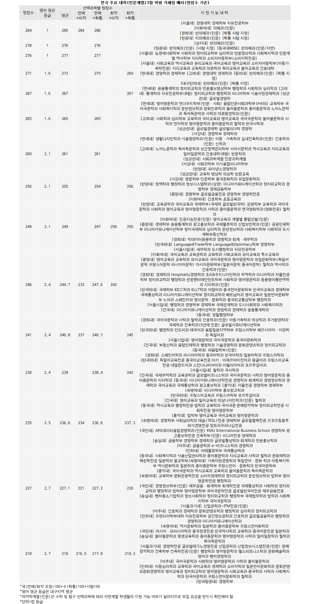 <인문.. 서울대 경영/경제/자전, 이대/경희대/원광대 인문 의약 288점 ‘최고’>