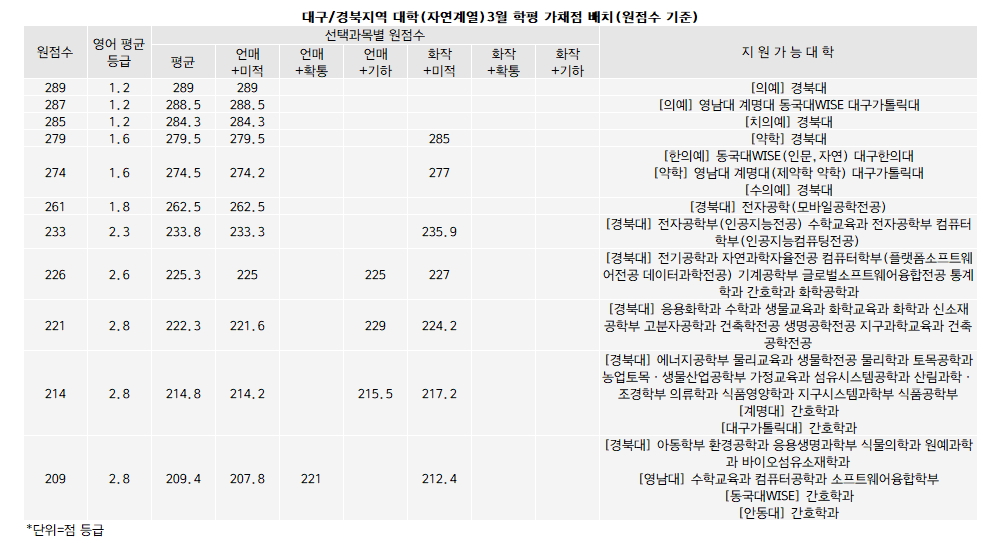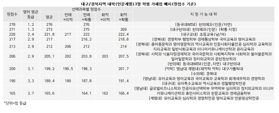 대구/경북으로 범위를 좁힐 경우 의약계열 강세가 두드러진다. 동국대WISE의 한의예(인문/자연)이 278점(평균 276점/언매+확통 276점)으로 가장 높다. 이어 대구한의대 한의예(인문)이 271점(273점/275점), 대구교대 초등교육이 220점(221.8점/222점)에 배치된다.