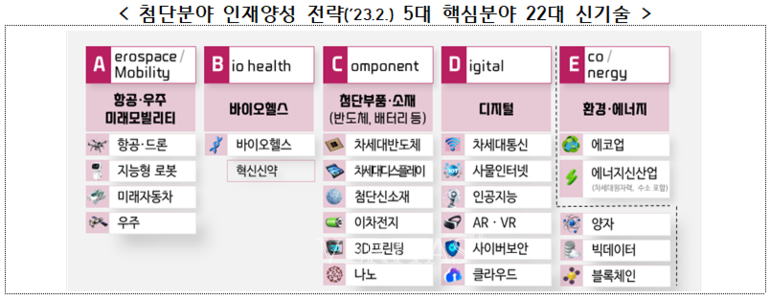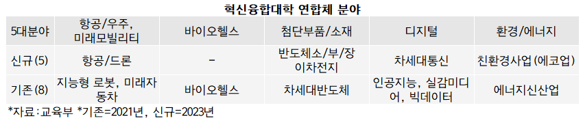 사업은 2021년 '디지털 신기술 인재양성 혁신공유대학'으로 시작되어 8개 분야의 대학 연합체를 선정했다. 전공간 융복합 교육과정 운영, 학사제도 개선 등을 지원하고 있다. 올해는 사업명을 '첨단분야 혁신융합대학'으로 바꾸고 비수도권 지자체가 컨소시엄에 참여하도록 했다. 5개 분야의 교육 역량을 갖춘 대학들(최대 5개교, 수도권/비수도권 각 40% 이상)과 산업 기반/전략을 보유한 비수도권 광역지자체가 함께 연합체를 구성해 신청하면 된다.