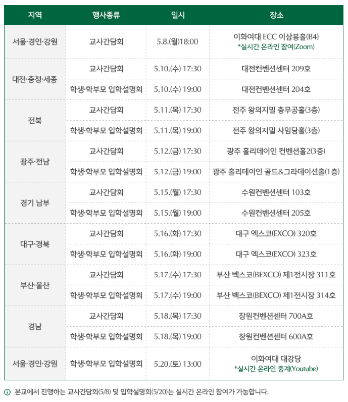 입학설명회와 교사간담회의 지역별 일정으로는 5월8일(교사간담회) 이화여대 ECC 이삼봉홀, 10일 대전컨벤션센터, 11일 전주 왕의지밀, 12일 광주 홀리데이인, 15일 수원컨벤션센터, 16일 대구 엑스코, 17일 부산 벡스코 제1전시장, 18일 창원컨벤션센터, 20일(입학설명회) 이화여대 대강당 순이다. 이화여대 본교에서 실시하는 행사를 제외하고 모든 교사간담회는 각 일정의 오후5시30분, 입학설명회는 오후7시에 진행한다. 5월8일에 실시하는 교사간담회는 오후6시, 20일에 실시하는 입학설명회는 오후1시에 진행한다. 두 일정의 경우 실시간 온라인 참여도 가능하다.