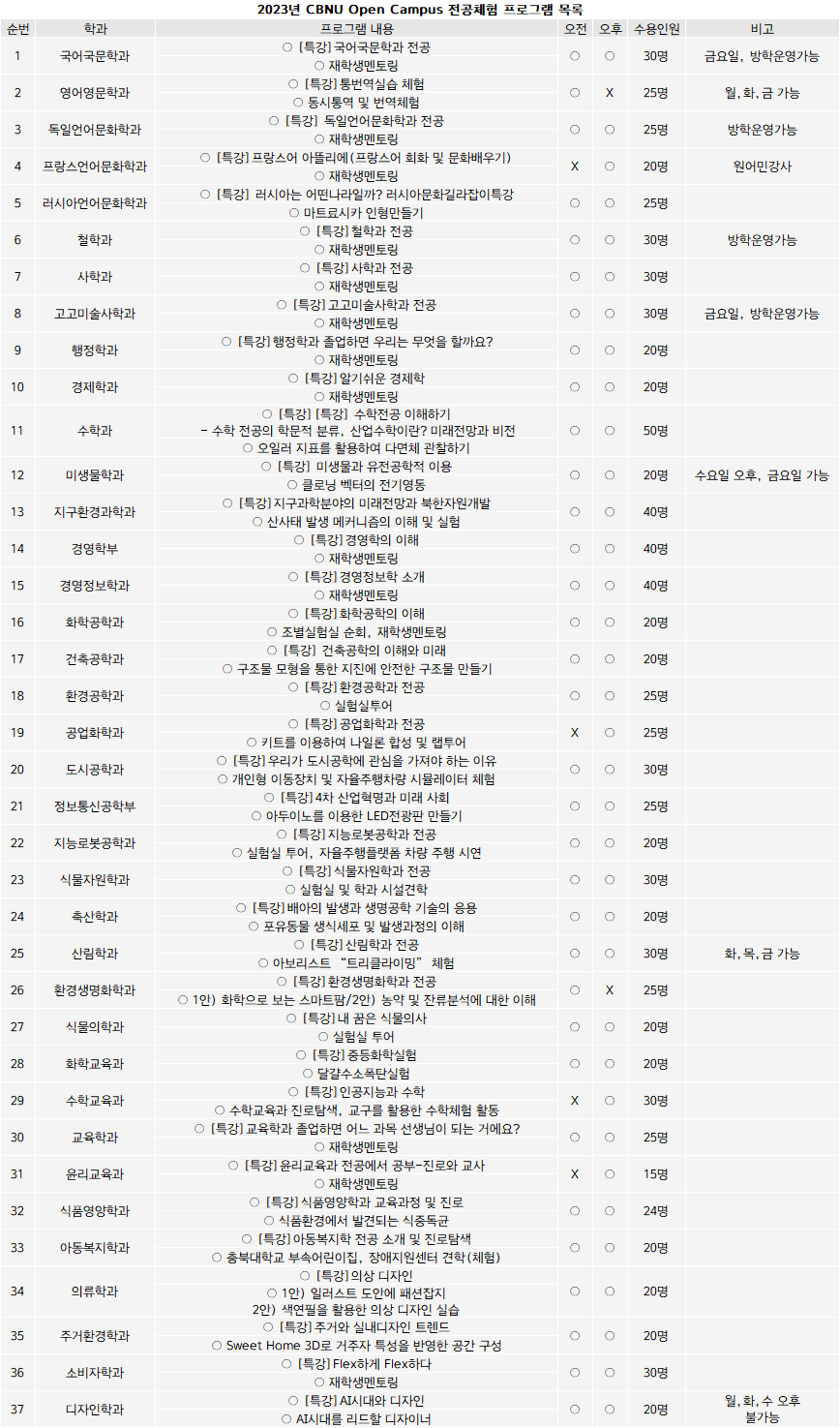 [베리타스알파=김해찬 기자] 충북대가 충청권 고교를 대상으로 진로체험 프로그램을 진행한다고 최근 밝혔다. 프로그램 명은 'CBNU Open Campus 전공체험'이다. 고교에서 희망 진로체험프로그램/방문일을 기재한 신청서를 제출하면, 충북대가 일정을 조율 후 날짜를 확정한다. 해당 날짜에 교교에서 대학을 방문, 프로그램을 진행하는 방식이다. 10개 단대 37개 학과에서 프로그램/특강을 준비했으며, 프로그램과 특강을 합쳐 약 2시간 진행된다. 프로그램별로 오전/오후 시행 여부를 확인해아한다. 참가신청은 충북대 홈페이지에서 할 수 있으며, 4월부터 8월까지 운영한다. 프로그램 날짜 기준 8주전부터 4주전까지 신청할 수 있다. 인터넷 신청 후 전화 확인을 해야 접수가 완료된다. 1일 1개교만 신청을 받으며, 최소 20명부터 최대 300명 학생이 참여할 수 있다.