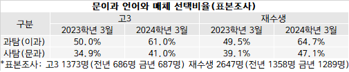 올해 3월학평 역시 특정 과목 쏠림은 마찬가지였다. 종로학원이 수험생 4000여 명을 표본조사한 결과, 고3 이과생 중 언매 선택 비율은 지난해 3월과 비교해 50%에서 61%까지 상승했으며 재수생 역시 49.5%에서 64.7%까지 상승했다. 실제 수능 역시 2022학년의 경우 이과생의 언매 선택 비율이 35.8%였지만 2023학년엔 44.4%로 크게 증가했다. 반면 문과생 중 언매 선택 비율은 25.1%에서 27%까지 소폭 상승에 그쳤다. 문과생보다 이과생 사이에서 과목 쏠림이 심화한 셈이다.