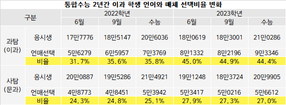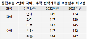 지난 2년간의 학습 효과로 수험생은 표점이 높게 나오는 과목으로 쏠리고 있다. 국어는 언매, 수학은 미적 또는 기하가 대표적이다. 2022학년 수능에서 국어 표점 최고점은 언매 149점, 화작 147점이었으며 2023학년엔 언매 134점, 화작 130점으로 점수 차가 더 커졌다. 수학 역시 2022학년 미적/기하는 각 147점, 확통은 144점이었으며 2023학년엔 미적이 145점, 기하 확통이 각 142점이었다.
