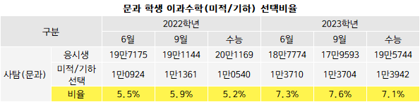 이러한 배경엔 통합수능의 표점 산출식이 있다. 공통과목 원점수 평균이 높을수록 표점도 높게 산출된다. 원점수 평균이 높은 과목 쏠림이 증가하는 이유다. 수험생 역시 전략적으로 표점에서 유리한 과목을 택해 응시하고 있다. 이과에서는 언매를, 문과에서는 미적을 택하는 식이다. 실제로 통합수능 1년 차인 2022학년 문과생의 이과 수학(미적/기하) 선택 비율은 5.2%에 그쳤지만 2년 차인 지난해 7.1%까지 상승했다. 종로학원은 2024수능에서는 10% 이상까지 확대될 것으로 전망했다. 특히 지난달 수험생 1052명을 대상으로 설문조사를 시행한 결과 문과생 15.9%가 이과 수학을 택할 것으로 응답했다.