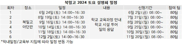 [베리타스알파=김해찬 기자] 전국 자사고 북일고가 2024학년 토요 입학설명회를 연다고 최근 밝혔다. 6월24일(토)을 시작으로, 8월 19일(토) 9월 16일(토) 10월 14일(토) 11월 18일(토) 12월 2일(토) 총 6회 모두 북일고에서 실시한다. 각 설명회당 80팀(가족 단위)이 참가할 수 있으며, 팀당 제한인원은 없다. 설명회에서는 북일고 교육과정에 대해 안내하고 학교 시설투어, 질답 시간 등을 가질 예정이다. 전국과 충남 모든 모집단위를 대상으로 진행한다. 참가신청은 각 설명회 약 3주전부터 북일고 홈페이지에서 가능하다. 가족 당 한명이 신청 후, 신청시에 본인 포함 참가인원 수를 기입하면 된다.
