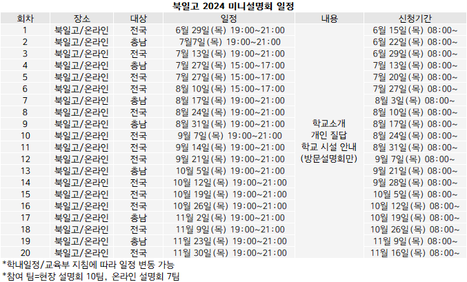 토요 설명회와 별도로, 평일 열리는 미니 설명회도 진행한다. 일정은 6월 29일(목)부터 11월30일(목)까지 매주 목요일 총 20회다. 설명회 내용은 유사하나 현장 설명회와 온라인 설명회로 나눠 진행하는 점, 회차별로 충남모집단위 설명회, 전국 모집단위 설명회가 정해져 있는 점이 다르다. 2회, 4회, 7회, 9회, 13회, 17회, 19회차 설명회는 충남 모집단위를 대상으로, 나머지 설명회는 전국 모집단위를 대상으로 설명회를 진행한다. 토요설명회보다는 작은 규모를 모집한다. 현장설명회 10팀 온라인 설명회 7팀이며, 참가 신청은 각 설명회 2주전 북일고 홈페이지에서 가능하다. 설명회 일정은 북일고 학내일정과 교육부 지침에 따라 변동될 수 있다.