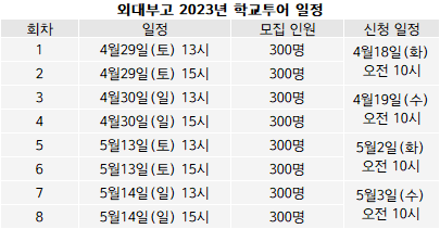 [베리타스알파=김해찬 기자] 전국 자사고 외대부고가 학생과 학부모를 대상으로 학교투어를 진행한다고 최근 밝혔다. 4월29일(토)를 시작으로 4월30일(일) 5월13일(토) 5월14일(일) 4일에 걸쳐 열리며, 각각 13시 15시 일정으로 나눠 총 8회 실시한다. 학교투어는 약 2시간정도 소요될 예정이다. 학생 포함 가족 1명까지 총 2명 참석할 수 있다. 참가신청은 외대부고 홈페이지에서 각 설명회 약 2주전부터 가능하며, 선착순 300명까지 신청할 수 있다.