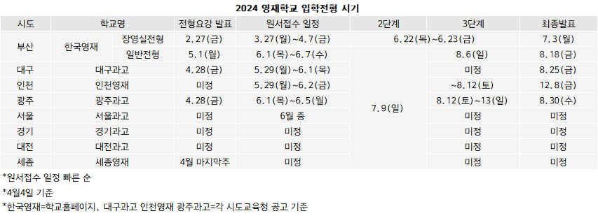 영재학교는 기본계획 일정을 기준으로 하는 다른 고교와 달리 별도의 일정을 운영해 학생을 선발한다. 서울교육청이 배포한 기본계획 자료에도 영재학교인 서울과고만 전형일정이 나와있지 않았고, 부산교육청 대전교육청 세종교육청 경기교육청 역시 각 한국영재 대전과고 세종영재 경기과고의 전형일정과 전형계획을 포함하지 않았다. 교육청 관계자는 “기본계획에 일정이 명확히 나와있는 곳은 초중등교육법 시행령에 따라 운영되는 학교들로 영재교육진흥법의 적용을 받는 영재학교와 근거 법률이 달라 일정 공시에서도 빠졌다”며 “다만, 별도로 교육혁신과와 대략적인 전형일정을 협의하기는 한다”고 밝혔다. 전형 시기에 따라 전기와 후기로 구분되는 고입 체계에서 영재학교는 전기고로 분류되긴 하지만, 사실상 세부 사안은 개별 학교 공시를 통해서만 알 수 있다. 수요자 입장에서는 개별 학교가 입시요강을 발표할 때까지 하염없이 기다릴 수밖에 없다.