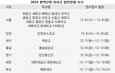 광역단위 자사고는 서울 16개 자사고(경희고 대광고 배재고 보인고 선덕고 세화고 세화여고 신일고 양정고 이화여고 이대부고 장훈고 중동고 중앙고 한대부고 현대고 휘문고)와 인천포스코고를 필두로 6일부터 원서를 접수한다. 서울 자사고 16개교 중 11개교는 남학교로, 세화여고 이화여고 2개교만 여학교다. 남녀공학은 이대부고 한대부고 현대고의 3개교로 지원 시 참고할 필요가 있다. 대구 계성고는 7일부터, 충남삼성고는 8일부터, 경기 안산동산고는 9일부터 원서를 접수한다. 해운대고와 대전대성고 대전대신고는 11일부터다. 광역자사고는 1단계 서류, 2단계 면접을 시행하는 게 보통이다. 서울 광역자사고의 경우 원서접수 경쟁률에 따라 선발 방식이 달라지는 특징이 있다.