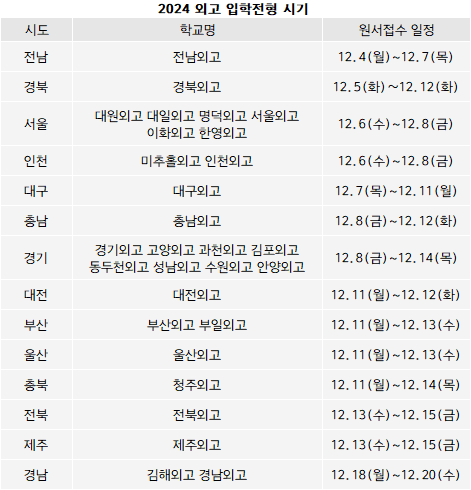 외고는 전남외고가 12월4일부터로 원서접수 일정이 가장 빠르다. 이어 경북외고가 5일부터, 대원외고 대일외고 명덕외고 서울외고 이화외고 한영외고 등 서울 소재 외고 5개교와 미추홀외고 인천외고 등 인천 소재 외고 2개교가 6일부터 원서를 접수한다. 대구외고가 7일부터, 경기외고 고양외고 과천외고 김포외고 동두천외고 성남외고 수원외고 안양외고 등 경기 소재 외고 8개교와 충남외고가 8일부터다. 11일부터 원서접수를 시작하는 곳은 부산외고 부일외고 대전외고 청주외고 울산외고이며, 전북외고 제주외고는 13일부터, 경남외고 김해외고는 18일부터다. 국제고와 마찬가지로 자기주도학습전형으로 선발한다.