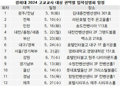 [베리타스알파=김해찬 기자] 경희대가 고교 교사를 대상으로 권역별 입학설명회를 진행한다고 최근 밝혔다. 5월9일 광주/전남을 필두로 전북 5월10일(수) 인천 5월16일(화) 대전/충청/세종 5월22일(월) 부산 5월23(화) 대구/경북 5월24(수) 서울/경기북부 6월2일(금) 강원 6월7(수) 경기남부 6월13(화) 울산 6월14(수) 경남 6월15(목) 제주 6월21(수)까지 전국 12곳에서 설명회를 진행한다. 설명회에서는 2023학년 입시결과, 2024학년 입학전형을 안내하고, 학종 모의 서류평가 프로그램이 진행될 예정이다. 서류평가 프로그램에서는 직접 지난해 경희대 수시 지원자의 학생부를 평가해본 뒤, 입학 사정관의 구체적인 해설을 들을 수 있다. 참가신청은 11일부터 경희대 입학처 홈페이지에서 가능하며, 고교 교사 또는 시도교육청 관계자만 모집한다.