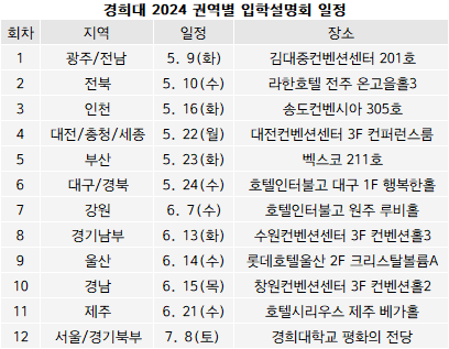 [베리타스알파=김해찬 기자] 경희대가 학생과 학부모를 대상으로 권역별 입학설명회를 진행한다고 최근 밝혔다. 5월9일 광주/전남을 필두로 전북 5월10일(수) 인천 5월16일(화) 대전/충청/세종 5월22일(월) 부산 5월23(화) 대구/경북 5월24(수) 강원 6월7(수) 경기남부 6월13(화) 울산 6월14(수) 경남 6월15(목) 제주 6월21(수) 서울/경기북구 7월8(토)까지 전국 12곳에서 설명회를 진행한다. 설명회에서는 2023학년 입시결과, 2024학년 입학전형, 학종 준비와 이해와 관련한 내용을 다룰 예정이다. 설명회 진행 후에는 질의응답과 1대1 입학상담 시간도 마련되어 있다. 참가신청은 11일부터 경희대 입학처 홈페이지에서 선착순으로 모집한다.