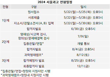 원서접수 일정은 5월22일부터 25일 오후5시까지다. 2단계 지필평가는 타 7개 영재학교와 동시에 7월9일 실시한다. 한국영재가 발표한 일반전형 2단계 창의적 문제해결력 검사 일정에 따라 8개교의 평가 일정이 해당일로 유력화됐었고, 이번 첫 공개된 서울과고의 모집요강에 따라 일정이 확실시된 셈이다. 영재학교는 중복지원이 허용됐던 2017학년부터 입시혼란을 줄이고 지원과열을 완화하고자 2단계 영재성 검사 일정을 통일해왔다. 2022학년부터는 중복지원이 금지되긴 했으나 이후로도 전국 8개 영재학교는 지필평가를 동시에 치르고 있다.