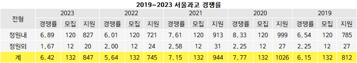 지난해 치른 2023학년 영재학교 입시에서 서울과고는 정원내 기준 6.89대1의 경쟁률을 기록했다. 모집인원 120명에 827명이 지원한 결과다. 전년인 2022학년 6.01대1(모집 120명/지원 721명)보다 소폭 상승했다. 동일한 모집인원에 지원자가 106명 증가한 것이다. 정원외 기회균형은 1.67대1(12명/20명)을 기록해 전년 2대1(12명/24명)보다 소폭 하락했다.