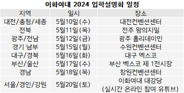 [베리타스알파=김해찬 기자] 이화여대가 2024 지역방문 입학설명회를 연다고 최근 밝혔다. 5월10일(수) 열리는 대전/충청/세종 설명회를 필두로 전북 5월11일(목) 광주/전남 5월12일(금) 경기 남부 5월15일(월) 대구/경북 5월16일(화) 부산/울산 5월17일(수) 경남 5월18일(목) 서울/경인/강원 5월20일(토) 전국 8곳에서 진행한다. 마지막으로 진행하는 서울/경인/강원 설명회의 경우 실시간으로 유튜브 온라인 방송도 중계한다. 별도의 사전 신청없이 현장 참석이 가능하며, 설명회에서는 2024 입학전형을 안내하고 실시간 질답시간을 가질 예정이다.