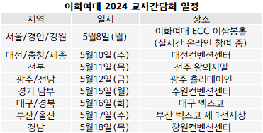 [베리타스알파=김해찬 기자] 이화여대가 2024 지역방문 교사간담회를 연다고 최근 밝혔다. 5월8일(월) 열리는 서울/경인/강원 간담회를 필두로 대전/충청/세종 5월10일(수) 전북 5월11일(목) 광주/전남 5월12일(금) 경기 남부 5월15일(월) 대구/경북 5월16일(화) 부산/울산 5월17일(수) 경남 5월18일(목) 전국 8곳에서 진행한다. 처음 열리는 서울/경인/강원 간담회의 경우 줌 화상통화 프로그램을 통해 온라인 참여도 가능하다. 간담회에서는 2023 전형결과와 2024 입학전형에 대한 정보를 제공받을 수 있다. 참가신청에서 접수하는 사전 질문지를 바탕으로 질답시간도 가진다. 참가신청은 이대 입학처 홈페이지에서 17일부터 20일까지다. 고교별 최대 2명의 교사가 참석 가능하며 선착순으로 조기 마감될 수 있다.