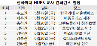 베리타스알파=김해찬 기자] 한국외대가 고교교사를 대상으로 'HUFS 교사 컨퍼런스'를 실시한다고 최근 밝혔다. 대입 전형에 대한 실질적인 정보를 제공하고 교사들의 진학지도 역량을 강화하기 위해 마련한 행사다. 한국외대 입학전형 안내와 결과 분석, 학종 제반 강의와 합격 학생부 사례 등을 공유할 예정이다. 내달 12일 수도권을 필두로 19일 제주 26일 충청 6월2일 강원 6월16일 경남 6월30일 경북 7월7일 전라 등 7곳에서 컨퍼런스를 진행한다. 참가 신청은 14일 오전 10시부터 한국외대 입학처 홈페이지에서 가능하다. 각 해당지역 고교교사 50명까지 선착순이다. 신청확정되는 교사에게는 별도로 문자를 발송한다.