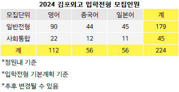 [베리타스알파=조혜연 기자] 김포외고가 전국 30개 외고 중 가장 먼저 2024학년 입학전형 기본계획을 발표하며 2024외고 입시의 막을 올렸다. 학교별 입학전형기본계획은 공지의무가 없지만 수요자들이 입시의 큰 틀을 참고할 수 있도록 배려하는 차원에서 발표하는 것이다. 김포외고는 지난해에 이어 2년연속 가장 발빠르게 입학전형 기본계획을 공개하면서 수요자 친화적인 행보가 돋보인다.
