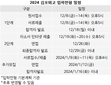 정원이 미달될 시에는 추가모집을 실시한다. 2024학년 고입전형에 응시하지 않았거나, 불합격한 자만을 대상으로 한다. 추가모집 일정은 내년 1월9일부터 11일까지다. 면접은 12일 실시하며, 합격자는 16일 이내에 발표한다.