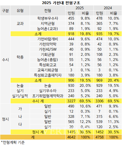 가천대는 2025대입에서 전형계획상 4642명을 모집한다. 2024전형계획상 4758명에서 116명 감소한 규모다. 수시 3227명(69.5%) 정시 1415명(30.5%)이다. 전형별로는 교과전형에서 학생부우수자 455명(9.8%), 지역균형 374명(8.1%), 농어촌(교과) 89명(1.9%)으로 918명(19.8%), 학종에서 가천바람개비 444명(9.6%), 가천의약학 39명(0.8%), 가천AI/SW 40명(0.9%), 기회균형 91명(2%), 농어촌(종합) 55명(1.2%), 특성화고교 54명(1.2%), 교육기회균형 3명(0.1%), 특성화고졸재직자 180명(3.9%)으로 906명(19.5%), 논술전형 930명(20%), 실기전형 233명(5%), 조기취업형계약 240명(5.2%) 등이다. 정시에서는 가군 일반 490명(10.6%)과 실기 12명(0.3%), 나군 일반 328명(7.1%), 다군 일반 565명(12.2%)과 실기 20명(0.4%) 규모다.