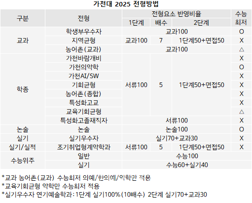 학종은 서류100%로 일괄합산하는 특성화고졸재직자를 제외하면 모두 단계별 전형으로 운영한다. 1단계에서 서류100%로 5배수를 선발한 뒤 2단계에서 1단계와 면접을 각 50% 비율로 반영한다. 수능최저는 가천의약 교육기회균형(약학)을 제외하면 모두 적용하지 않는다. 가천의약 수능최저는 교과 학생부우수자와 같다. 교육기회균형(약학) 수능최저는 농어촌(교과) 약학 수능최저와 같다.