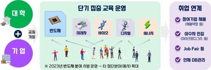 사업은 정부의 '반도체 인재양성 방안'과 연계해 마련됐다. 다양한 배경의 학생들이 현장에 바로 투입될 수 있도록 집중교육을 실시한다. 대학과 기업은 현장성 높은 단기 집중 교육프로그램을 운영, 1년 이내 집중교육을 통해 인재를 양성한다. 교육을 이수한 학생들은 '소단위 학위 이수증'을 발급받게 되며 이는 취업 등에 활용할 수 있게 된다. 대학은 사업 추진체계를 구축하고 몰입형, 교과형 등 학생 수준에 맞는 교육과정을 운영하게 된다. 뿐 아니라 지역기업 섭외, 시설활용 등 지자체와 협업도 추진해가야 한다.
