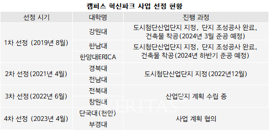 대학은 도시첨단산업단지 조성비와 기업 입주 공간으로 활용되는 산학연 혁신허브 건축비도 일부 국비로 지원받을 수 있다. 수도권은 95억원, 지방은 190억원에 달한다. 그간 3차례의 공모를 통해 7개 대학이 사업대상으로 선정됐다. 1차에서는 강원대 한남대 한양대ERICA가 선정돼 단지 조성공사를 마쳤다. 건축물 역시 내년 초 준공될 예정이다. 2차에는 경북대와 전남대, 3차에서는 전북대와 창원대가 선정돼 산업단지 조성을 추진하고 있다.