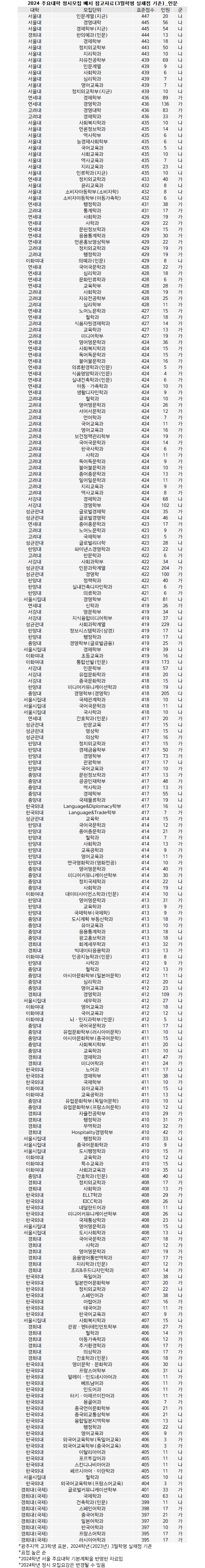 인문계열은 서울대 인문계열(지균)이 표점 447점으로 최고 점수다. 이어 서울대 경영, 경제(지균)가 445점, 경희대 한의예(인문)이 444점으로 톱3를 차지했다. 서울대는 일반전형과 지역균형전형(지균)의 표점 합격선을 각각 구분해 공개했다.