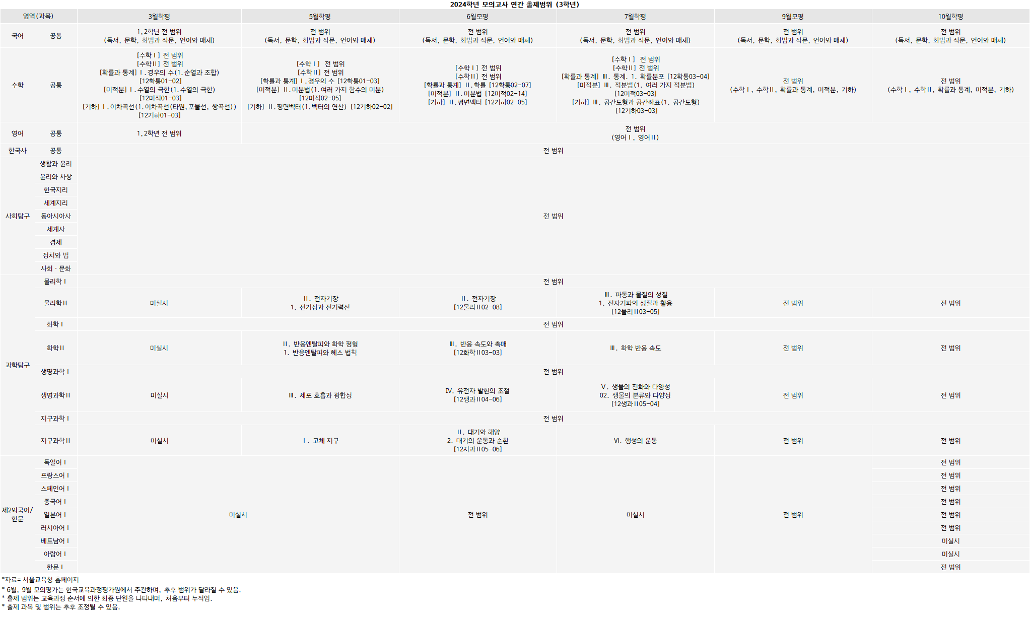 고3 기준, 국어와 영어의 경우 4월학평부터 전범위 출제가 이뤄진다. 국어는 독서 문학 화법과작문 언어와매체 전 범위이며 영어는 영어Ⅰ 영어Ⅱ 전 범위이다. 앞서 실시한 3월학평에서만 전범위 출제가 이뤄지지 않았고, 국어와 영어 모두 1~2학년 교육과정 전 범위가 출제됐다. 이어지는 6월모평 7월학평 9월모평 10월학평 등에서는 모두 전범위에서 출제된다.