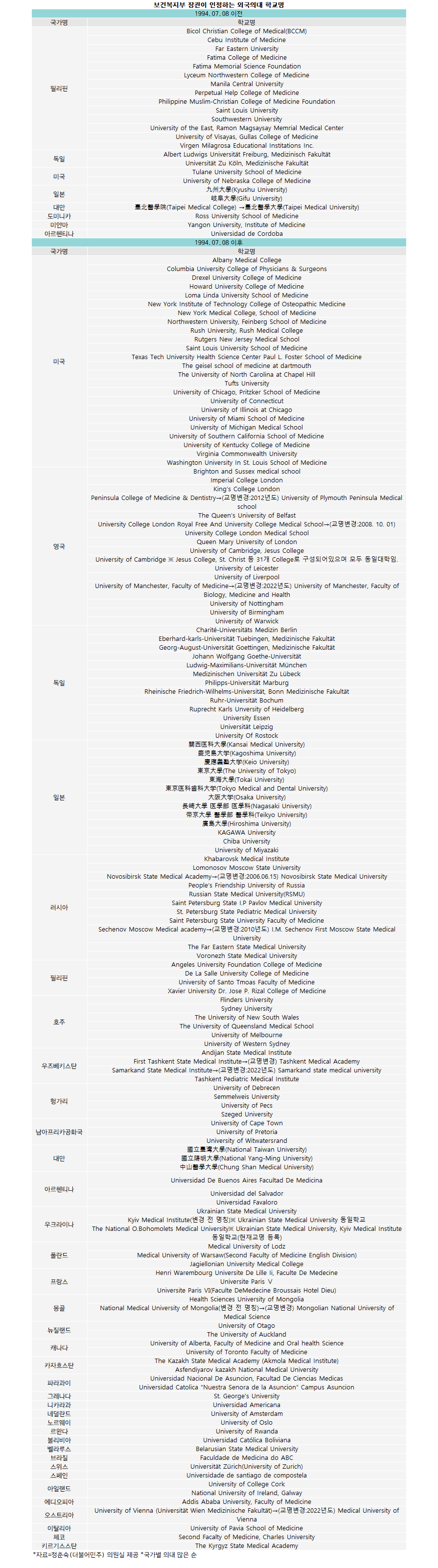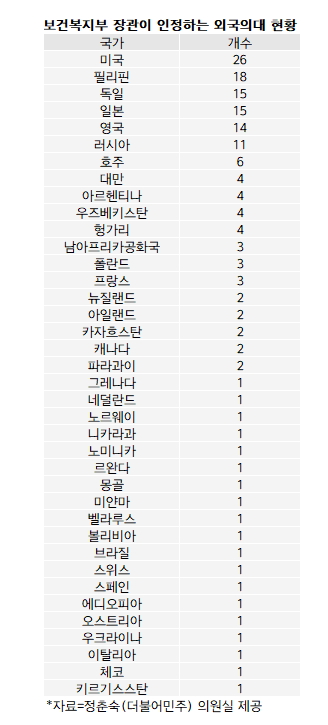 자료에 따르면, 복지부 장관이 인정한 외국 의대가 가장 많은 국가는 미국으로 26개 의대에 달했다. 이어 필리핀 18개, 독일 15개, 일본 15개, 영국 14개, 러시아 11개, 호주 6개, 아르헨티나 4개, 우즈베키스탄 4개, 헝가리 4개, 남아프리카공화국 3개, 폴란드 3개, 프랑스 3개, 뉴질랜드 2개, 아일랜드 2개, 카자흐스탄 2개, 캐나다 2개, 파라과이 2개, 그레나다 1개, 네덜란드 1개, 노르웨이 1개, 니카라과 1개, 도미니카 1개, 르완다 1개, 몽골 1개, 미얀마 1개, 벨라루스 1개, 볼리비아 1개, 브라질 1개, 스위스 1개, 스페인 1개, 에티오피아 1개, 오스트리아 1개, 우크라이나 1개, 이탈리아 1개, 체코 1개, 키르기스스탄 1개 등이었다.