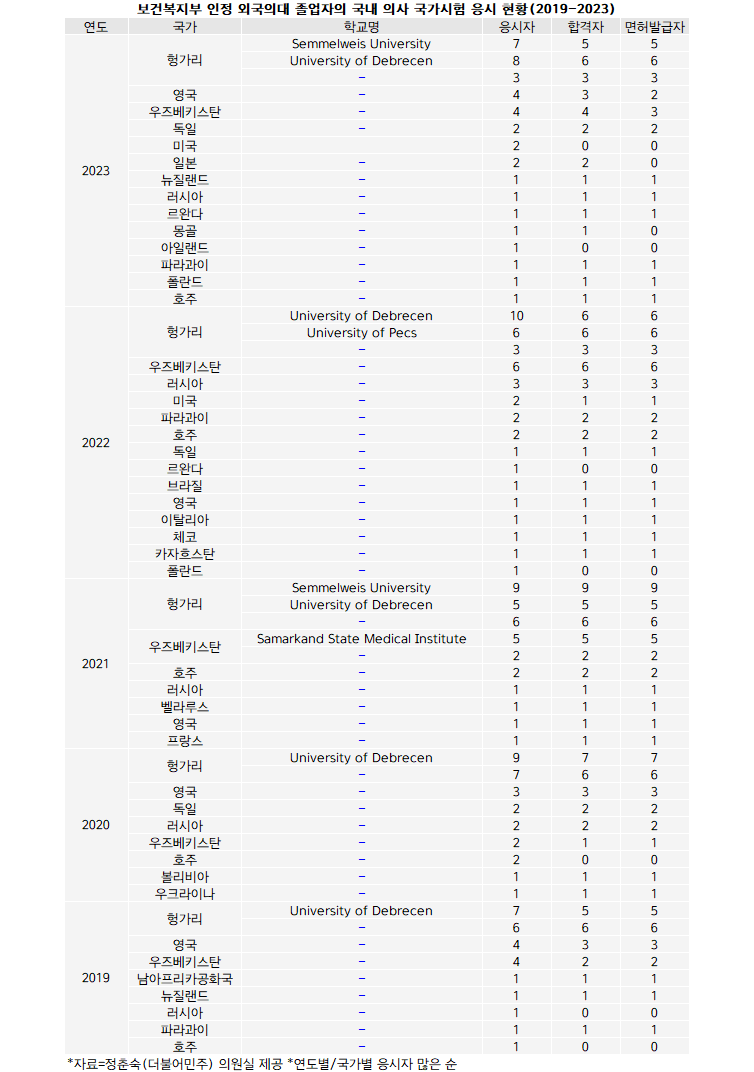 정부가 인정한 외국 의대가 가장 많은 국가는 미국이지만, 최근 5년간 국내 의사 국가고시에 가장 많이 합격한 외국 의대는 헝가리 의대인 것으로 나타났다. 외국 의대를 졸업해 해당 국가의 의사면허를 취득한 한국인 중 2019∼2023년 최근 5년간 국내 의사 국시에 가장 많이 합격해 한국 의사면허를 받은 사람들은 헝가리 의대 출신들이다. 같은 기간 헝가리 의대를 졸업하고 헝가리의 의사면허를 얻은 사람 중에서 총 86명이 국내 의사 국시를 보고 73명이 합격해 전원 국내 의사면허를 발급받은 것으로 알려졌으며 합격률은 85%를 보였다.