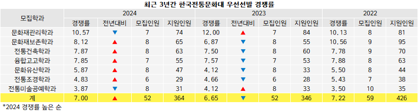 올해 전통문화대의 우선선발 경쟁률은 7대1이다. 정원내 52명 모집에 364명이 지원했다. 우선선발이 처음 도입된 2022학년엔 7.22대1(모집 59명/지원 426명)의 경쟁률을 기록했다가 지난해인 2023학년엔 6.65대1(52명/346명)로 하락. 올해는 다시 소폭 상승한 모습이다.