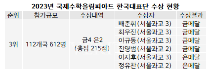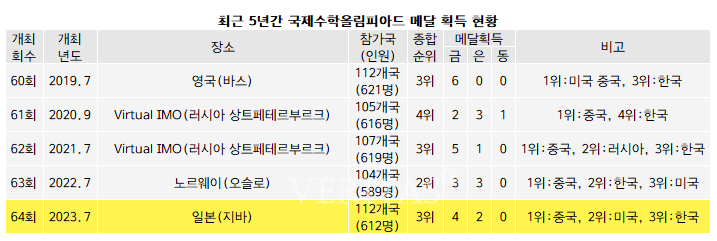 최근 5년간 국내 종합순위를 살펴보면 60회(2019년) 3위, 61회(2020년) 4위, 62회(2021년) 3위, 63회(2022년) 2위, 64회(2023년) 3위의 추이다. 지난해의 경우 104개국 589명의 학생이 참가한 가운데 한국대표단 6명 모두 메달을 획득했다. 배준휘(서울과고2) 이규동(서울과고2) 최우진(서울과고2)학생이 금메달, 김동현(서울과고3) 정유찬(서울과고1) 진영범(서울과고1) 학생이 은메달을 획득해 총점 208점으로 세계 2위를 기록했다.