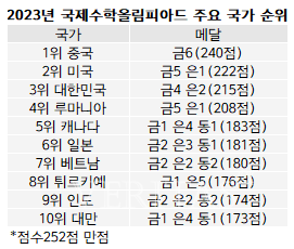 대회에는 세계 112개국 612명의 학생들이 참가했다. 한국은 금4 은2를 획득해 총점 215점으로 국가 종합 3위를 달성했다. 지난해 2위에서 한 계단 하락했다. 1위는 금6개로 총점 240점을 획득한 중국이다. 미국이 금5 은1 총점 222점으로 뒤를 잇는다.