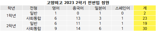 [베리타스알파=김해찬 기자] 고양외고가 2023 2학기 전편입생을 모집한다고 14일 밝혔다. 1학년 일반 2명, 사회통합 23명, 2학년 일반 19명, 사회통합 30명을 모집한다. 세부 정원은 1학년 일반 영어 일본어 각 1명, 사회통합 영어 6명, 중국어 13명, 일본어 3명, 스페인어 1명, 2학년 일반 영어 6명, 중국어 11명, 일본어 스페인어 각 1명, 사회통합 영어 9명, 중국어 14명, 일본어 6명, 스페인어 1명 등이다.