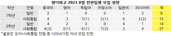 [베리타스알파=김해찬 기자] 명덕외고가 2023학년 8월 전편입생을 모집한다고 18일 밝혔다. 모집 정원은 1학년 일반 6명, 사회통합 15명, 2학년 일반 14명, 사회통합 27명이다. 전공별 세부 정원은 1학년 일반 중국어 러시아어 각 2명, 영어 일본어 각 1명, 사회통합 중국어 4명, 영어 독일어 러시아어 각 3명, 프랑스어 2명, 2학년 일반 중국어 일본어 각 4명, 독일어 3명, 영어 2명, 러시아어 1명, 사회통합 프랑스어 7명, 독일어 6명, 중국어 러시아어 각 4명, 영어 일본어 각 3명 등이다.