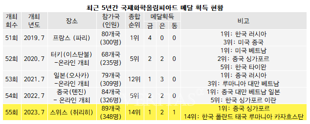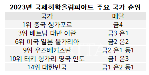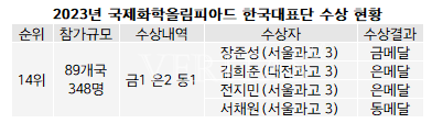 [베리타스알파=신현지 기자] 제55회 국제화학올림피아드(International Chemistry Olympiad, IChO)에서 한국대표단 전원이 메달을 획득했다. 장준성(서울과고3) 학생이 금메달을 획득했으며 김희준(대전과고3) 전지민(서울과고3) 학생이 은메달, 서채원(서울과고3) 학생이 동메달을 획득하면서 국가종합 14위에 올랐다. 지난해 대회에서 세계5위에 오른 것과 비교해 다소 하락한 순위다. 올해 국가종합 1위는 금4개를 획득한 중국과 싱가포르였다.