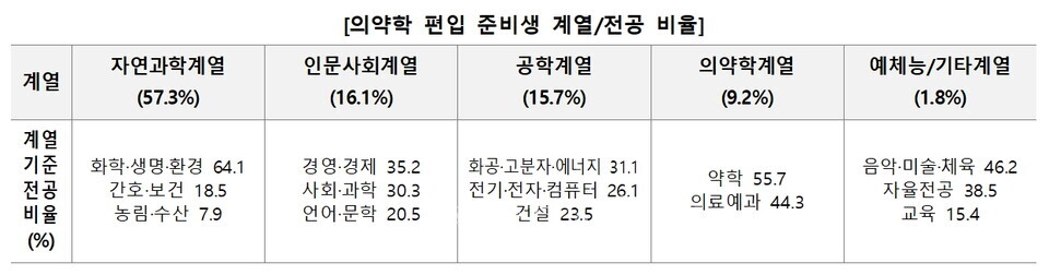 의약학계열은 9.2%로 나타났으며 약학전공은 55.7%, 의료예과 전공은 44.3%였다. 약학의 경우 의대편입을, 의료예과의 경우는 서울수도권 의대나 규모가 큰 대학으로 편입하기 위함으로 보인다.