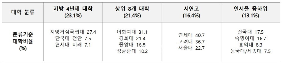 지방 4년제 대학 중에서 지방거점국립대의 비율은 27.4%였고, 다음으로 단국대 천안 7.5%, 연세대 미래 7.1% 순이었다. 상위 8개 대학에서는 이화여대가 31.1%로 가장 높았고, 다음으로 경희대 21.4%, 중앙대 16.8% 순이었다. 서연고에서는 연세대가 40.7%로 가장 높았고, 다음으로 고려대 36.7%, 서울대 22.7% 순이었다. 인서울 중하위 대학에서는 건국/동국/.홍익/숙명이 50.0%를 차지했다.