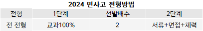 전형방법 역시 지난해와 동일하다. 1단계에서 교과성적만 100%를 반영해 300명 이내를 선발하며, 2단계에서 서류 면접 체력검사를 종합해 최종합격자를 선발하는 방식이다. 대부분의 자사고가 주요 과목의 교과 성취도점수만 전형에 반영하는 반면 민사고는 전 과목을 모두 반영하는 특징이 있다. 다만 교과별로 반영단위가 다르다. 국어 수학 과학 영어가 가장 반영단위가 높다.