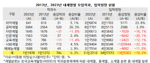 18일 교육위 소속 서동용(더불어민주) 의원이 2013년과 2023년 전국 4년제 대학의 계열별 입학 정원을 분석한 결과, 자연/인문/사회 계열 등 순수/기초 학문 분야 정원은 최소 16.1%에서 최대 22.3%까지 축소됐다. 자연계열의 경우 스마트모빌리티 로봇시스템 등 최근 정부가 지원하는 융복합 중심 학과의 정원은 증가했지만 토목/도시 산업 등은 정원이 감소했다. 특히 특히 과학자를 양성하는 순수 학문인 자연계열은 16.1% 축소됐다. 인문계 역시 심각하다. 사회계열의 경우 22.3% 축소했으며 인문계열은 20.1%, 교육계열은 12.1% 축소됐다. 의약계열의 경우 23.8%까지 확대됐지만 약대의 학부 선발 전환과 의전원의 의대 회귀를 고려해야 한다. 2013년 수치와 달리 2023년의 경우 2022학년 약대 학부 선발 전환으로 약대 모집 인원이 증가했으며 의대는 2016년 동국대, 2017년 제주대, 2019년 강원대, 2020년 건국대 등 4개 의전원의 의대 회귀 영향으로 인원이 증가했다.
